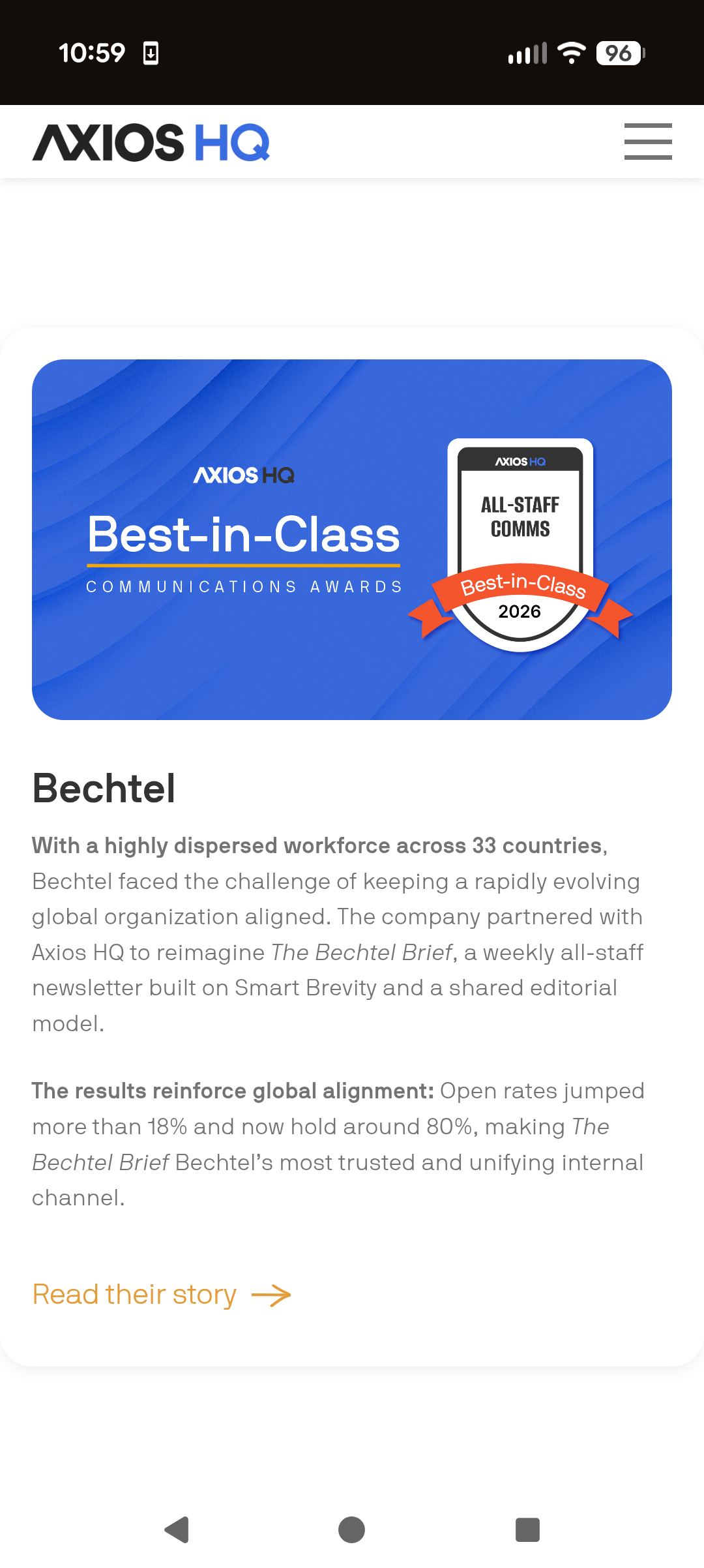 Published weekly and reaching tens of thousands of employees across 33 countries, the Brief is Bechtel's flagship internal newsletter. It's a carefully crafted publication that earns an open rate of around 80% week over week.